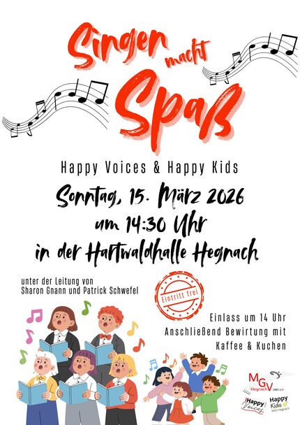 Die Happy Voices und die Happy Kids singen mit Ihren Chorleitungen ein buntes ca. 45 Minuten dauerndes Programm. Anschließend bewirten wir in der Hartwaldhalle mit Kaffee und leckerem selbstgebackenem Kuchen. Kaltgetränke gibt es selbstverständlich auch!